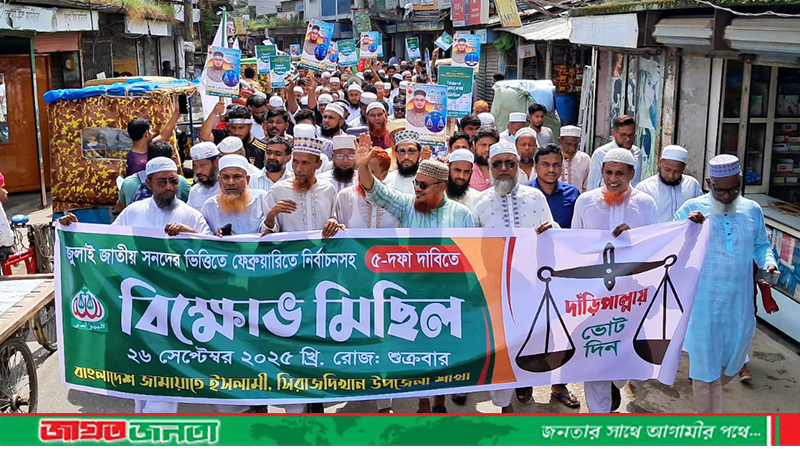 আগামী ফেব্রুয়ারিতে জুলাই সনদের ভিত্তিতে জাতীয় নির্বাচন অনুষ্ঠানসহ কেন্দ্র ঘোষিত ৫-দফা দাবিতে মুন্সীগঞ্জ সিরাজদিখানে বিক্ষোভ মিছিল করেছে বাংলাদেশ জামায়াতে ইসলামী। শুক্রবার উপজেলা শাখার উদ্যোগে বেলা ১১টায় সিরাজদিখান গোয়ালবাড়ি মোড়, (ইউএনও পার্ক) সিরাজদিখান ভূমি অফিস সংলগ্ন এলাকা থেকে বিক্ষোভ মিছিল শুরু হয়ে শহরের প্রধান প্রধান সড়ক প্রদক্ষিণ শেষে উপজেলা মোড় বাস স্ট্যান্ড মোড়ে এসে সমাবেশে মিলিত হয় ।